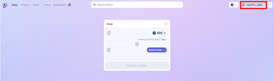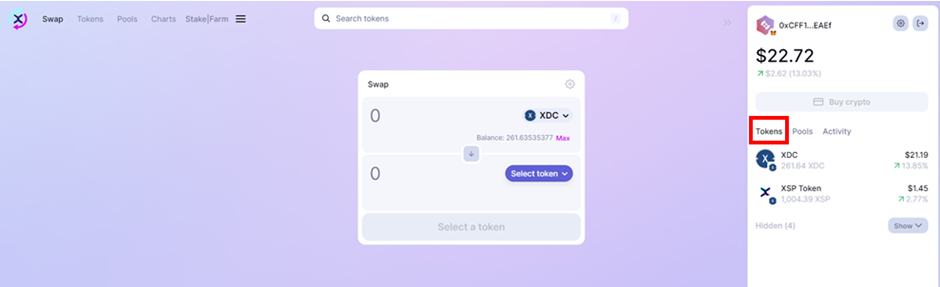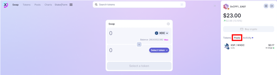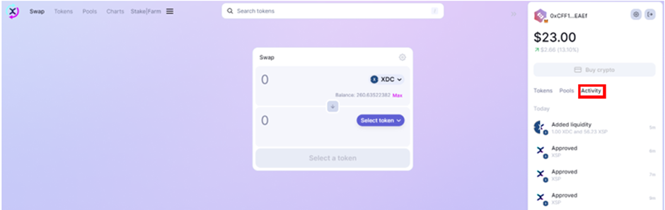 **Step 2:** Users click on the button “Tokens”, “Pools” and “Activity to view their available tokens, personal pool and transaction history.